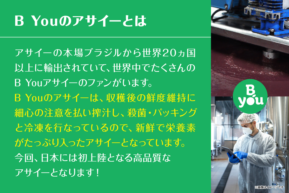 B Youとは、ブラジルの大手ブランドで、アサイーの本場ブラジルから世界20ヵ国以上に商品が輸出されています。