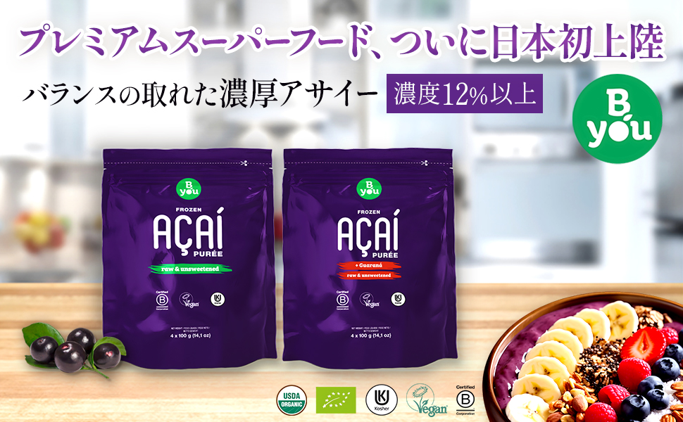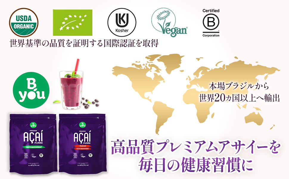B Youアサイーは、各種公的な国際認証を受けており、 USDAオーガニック、EUオーガニック、KOSHER、ヴィーガン(VEGAN)、B Corp認証を受けた高品質なアサイーです。B Youは製品に自信があるため、各種認証を積極的に受け、お召し上がりいただくお客様に安心を提供しています。